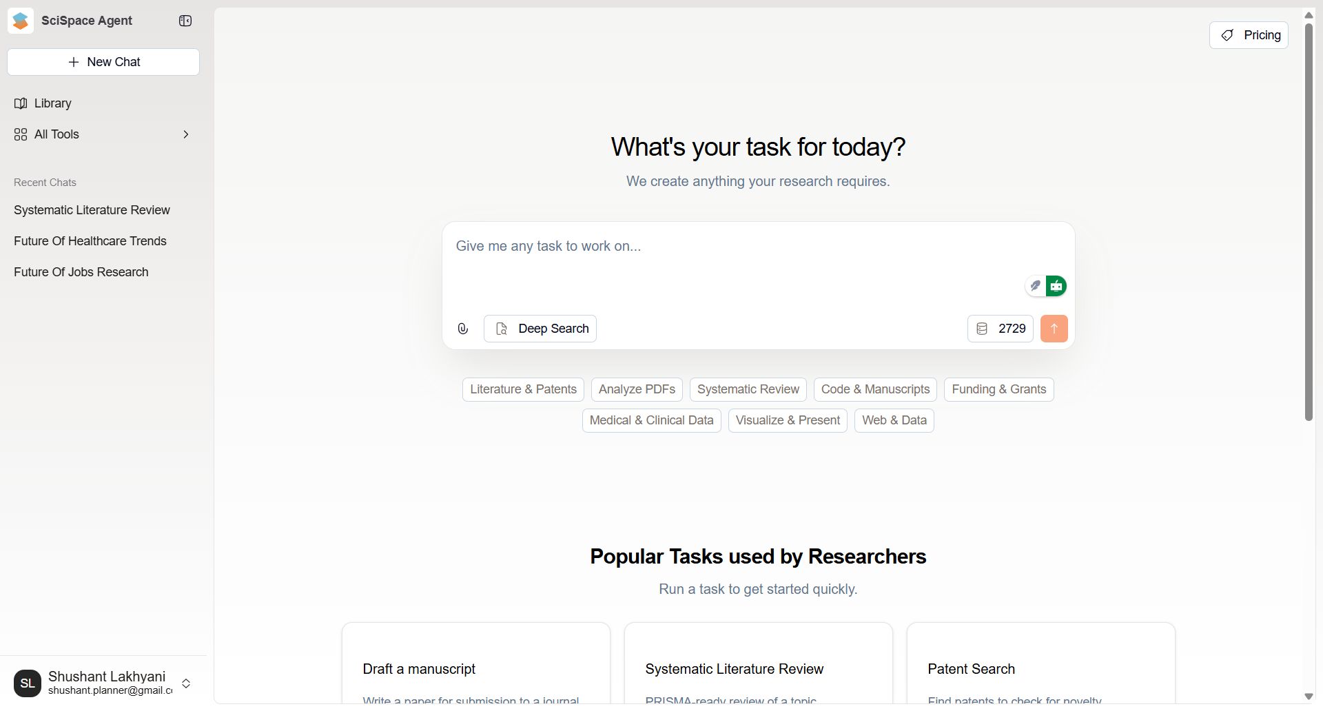 Core features: Unites hundreds of academic tools and databases in one platform. With a single prompt, it reads literature, analyzes data, drafts papers