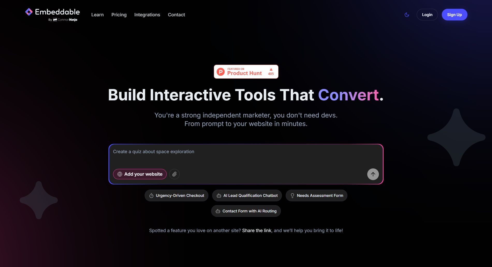 Core features: Build interactive tools like forms, popups, quizzes, and scratch cards to boost engagement and convert more leads. No code needed. Just type a prompt, customize the result, and embed a lightweight, SEO-friendly script on your site in minutes.