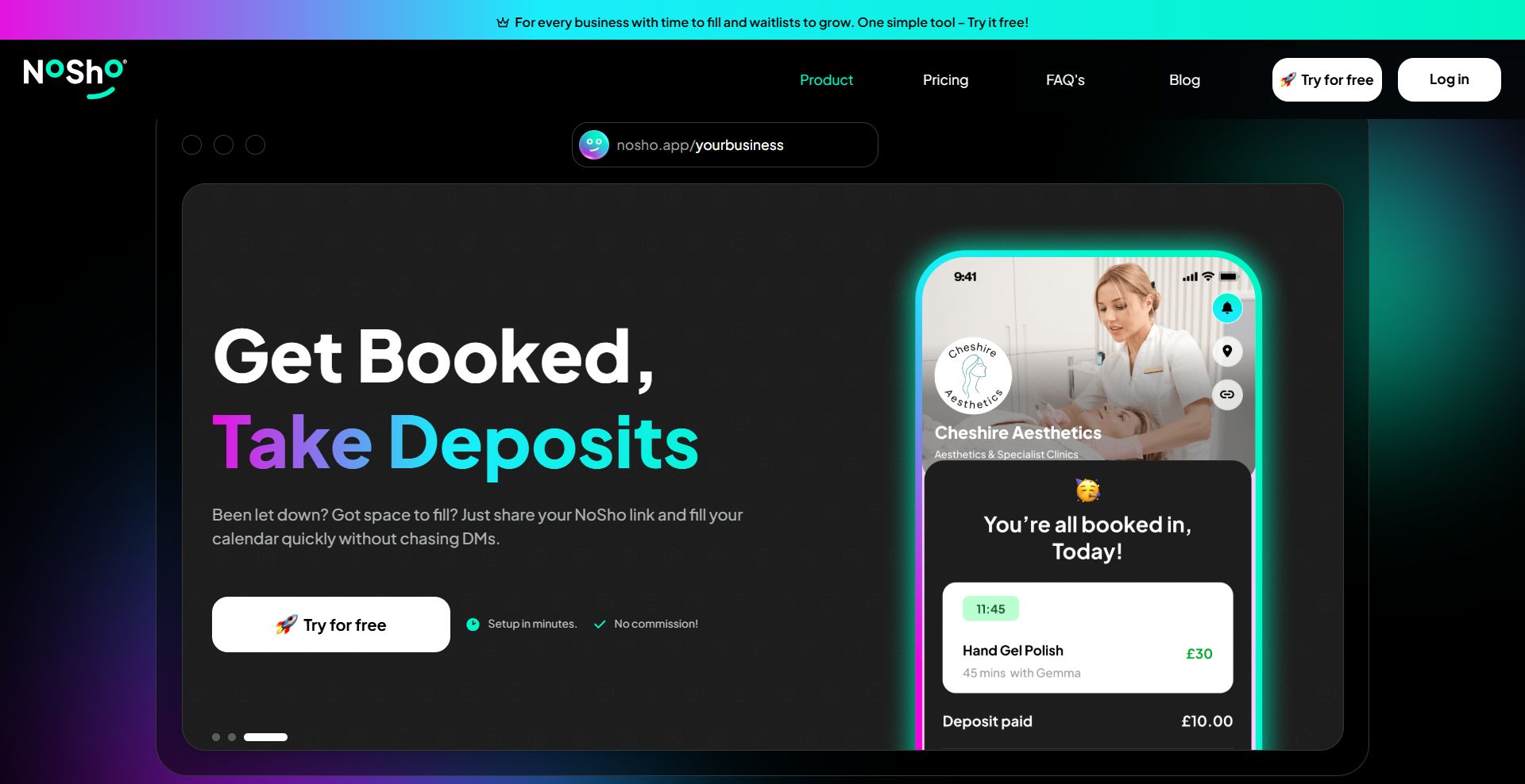 Core features: simple link for businesses to grow their waitlist and fill last-minute availability with deposits fast. Make the availability you want booked fast visible to customers with one click, stop promoting slots you have hidden in a booking system maze. No more chasing messages or posting Stories that vanish in 24 hours. Just share your NoSho profile, automatically notify customers when new slots are added and get booked securely.