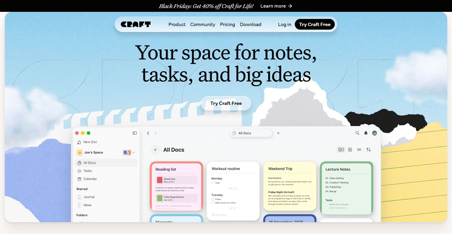 Core features: Your ideas, tools, and AI now come together in a connected workspace that feels effortless. With a smarter context-aware Assistant, new API & MCP connections, and a smoother flow across Tabs, Whiteboards, and the Code Editor, Craft turns thoughts into action.