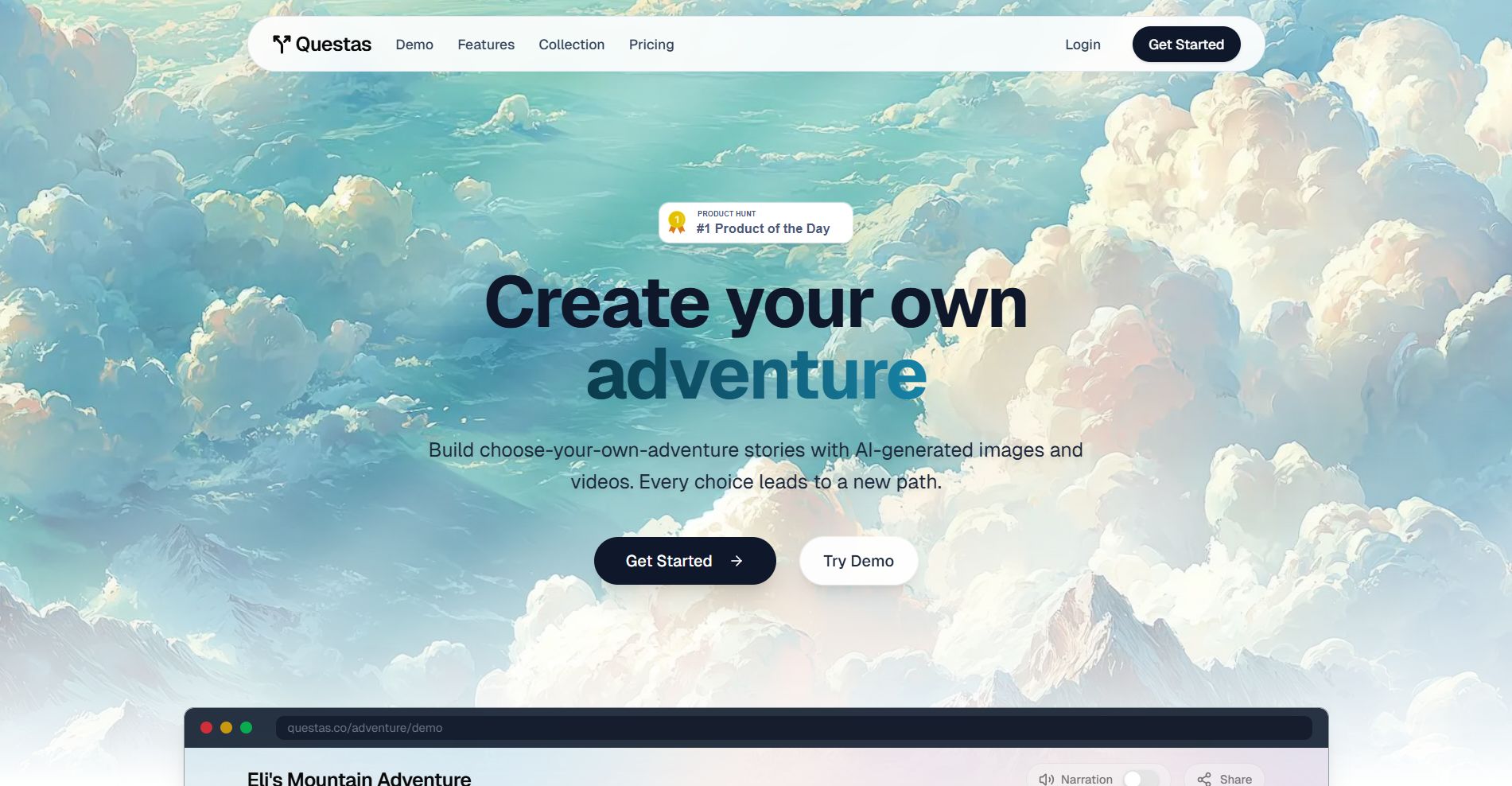 Core features: lets you build choose-your-own-adventure stories with AI-generated images and videos. Start with a character and a simple concept, and Questas turns it into a branching story you can edit, share, and play through like an interactive book.